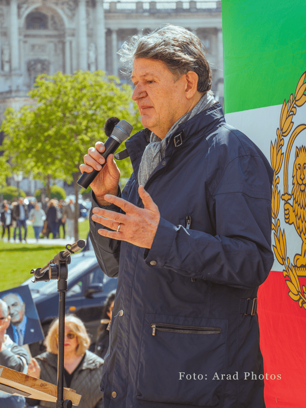 Zunächst möchte ich den Gruppen danken, die in der Stadt in diesem nationalen Kampf zusammenarbeiten und diese Veranstaltungen organisieren, damit wir ans Ziel gelangen — einzeln und namentlich danke ich ihnen. Applaus für die Royalistischen Vereinigung Safhe. Die Internationale Menschenrechtsvereinigung Österreich. Die patriotischen Ärztinnen und Ärzte Österreichs. Anwar Hamdosti, Herr Sadeghi. Anvar Mehr Iran und ein besonderer Dank an die Jugendlichen, genannt „Kinder der Botschaftsgasse“ — sie standen mehr als neunzig Tage bei Kälte und Hitze, neunzig Tage lang mit Bewahrung nationaler Disziplin, und sie ließen die Flagge der Nationalen Sonnenrevolution nicht sinken. Zuerst standen sie vor der besetzten Botschaft, einem Teil unseres Landes, und heute mit ihrer neuen Strategie stehen sie an vielen Stellen dieser Stadt und sind die Stimme des iranischen Volkes. Ich danke jedem Einzelnen von ihnen und verneige mich vor ihrem Einsatz. Ich bitte Sie, einige Minuten auszuharren. Dann werde ich die Ehre noch weiter ausdrücken.