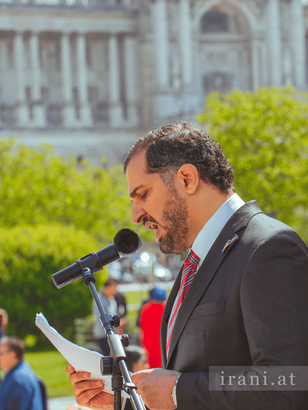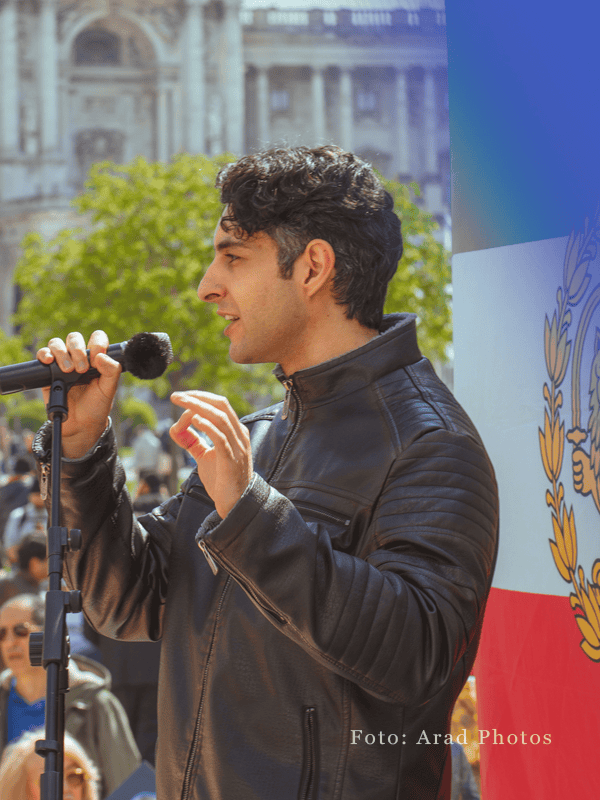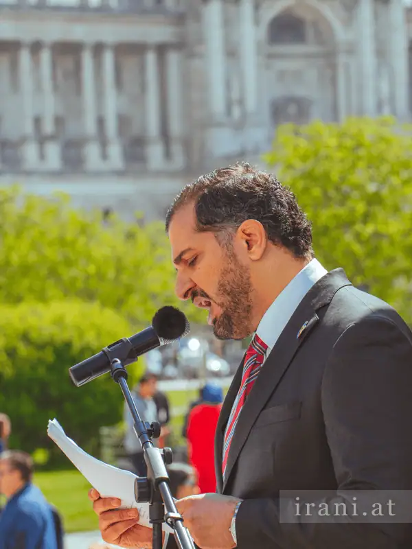 Genauso behandelten sie Mohammed Reza Schah Pahlavi: Sie kehrten ihm den Rücken, diffamierten ihn und setzten unsere Bevölkerung fünfzig Jahre lang Mord, Terror und Vergewaltigung aus. Es ist noch Zeit, das zu ändern und sich auf die richtige Seite der Geschichte zu stellen. Trotzdem haben wir uns gesammelt — das sah man in München, Toronto, L.A. und in allen anderen großen Städten dieser Welt. Auch hier in Wien. Wir sind vereint. Und ob man es will oder nicht: Wir haben unsere Wahl getroffen. Reza Schah der Zweite. My voice, my choice. Gemeinsam mit ihm an unserer Spitze werden wir uns den Iran zurückholen.