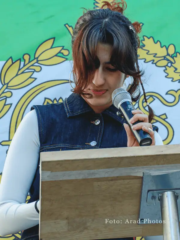 Im Rahmen der Kundgebung folgte eine Reihe von Redebeiträgen, in denen Rednerinnen und Redner eindrücklich über den aktuellen Zustand Irans sowie über die Ziele der Löwe‑und‑Sonne‑Revolution 2026 sprachen. Sie schilderten die politische, soziale und wirtschaftliche Lage im Land, machten auf anhaltende Repression, Menschenrechtsverletzungen und den Verlust grundlegender Freiheiten aufmerksam und betonten zugleich den wachsenden Widerstand innerhalb und außerhalb Irans.
