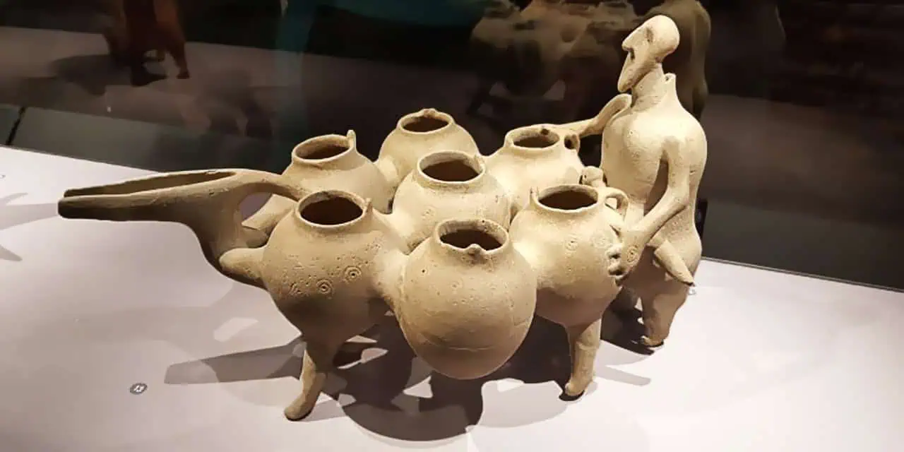 In einem Grab wurden aufwendige Weinzeremonien mit speziell angefertigten Krügen abgehalten. Wie dieser Tonkrug, hergestellt zwischen 850 und 550 v. Chr., mit nicht weniger als sieben miteinander verbundenen Krügen und einem schnabelförmigen Ausguss.